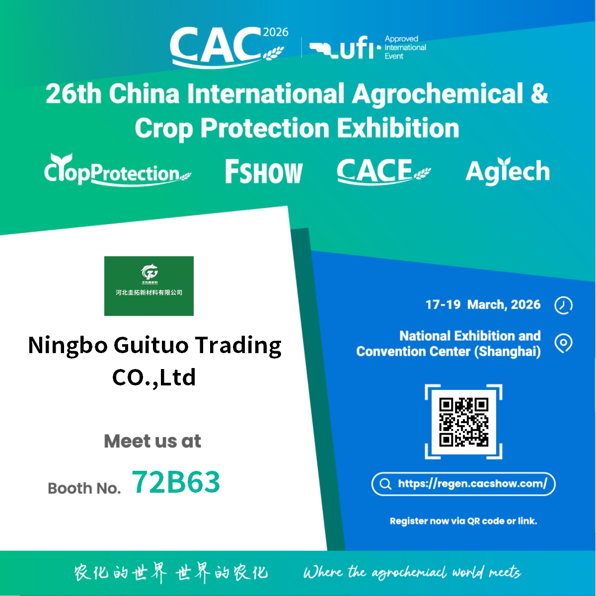 Ningbo Guituo Perdagangan Co, Ltd. dengan bangga mengumumkan partisipasinya dalam Pameran Agrokimia & Perlindungan Tanaman Internasional Tiongkok ke-26 (CAC 2026) . Ajang bergengsi berskala global ini akan berlangsung mulai dari 17 hingga 19 Maret 2026 , di Pusat Pameran dan Konvensi Nasional di Shanghai.